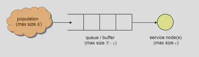 A generalised single queue system can be denoted as $ M/M/c/N/K $, where: